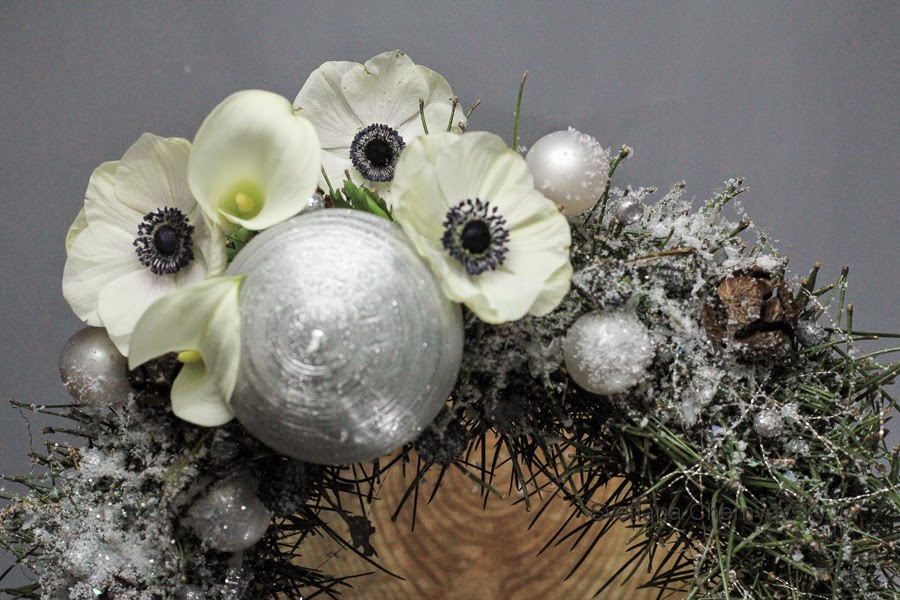 Сочетание природный поверхностей дерева и иглицы и металлического блеска серебристой свечи, елочных игрушек и фарфора калли анемон завораживает и манит, предлагая исследовать новогодний венок дальше.
