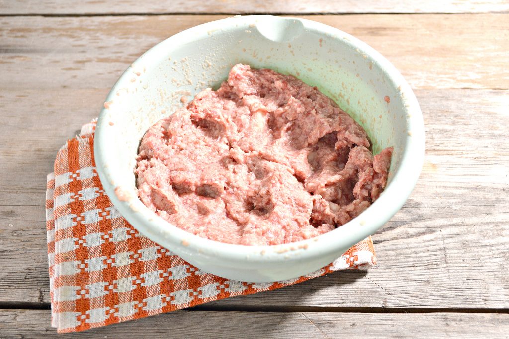 Перемешиваем фарш руками до однородности. Фарш не должен быть сухим, это зависит от свинины: если на кусочке есть сало, то фарш получится хорошей сочности, а если чистое мясо, то в фарш можно влить немного воды. Пробуем кончиком языка фарш на соль и если нужно, то досаливаем. Фарш готов.