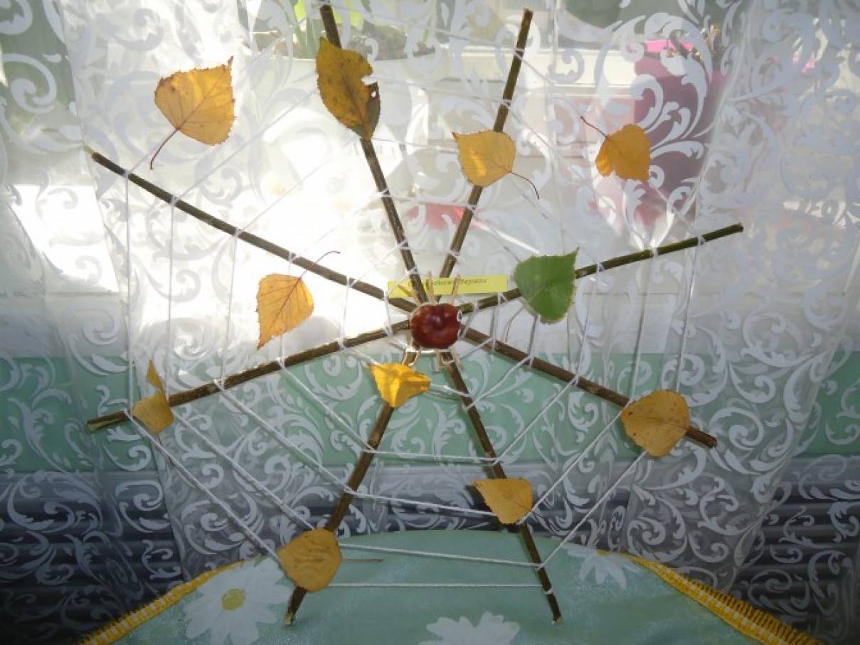 Паутина с пауком из каштана с листочками.