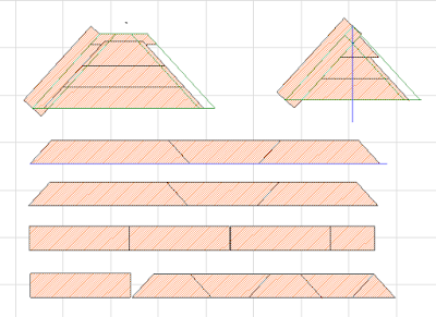 Я планировал расскроить ANDEREP ULTRA как показано на рисунке выше. Но не тут-то было. У ULTRA нижний слой полностью самоклеющийся, поэтому этот ковер уже нельзя перевернуть нижней стороной кверху, как я сделал с ANDEREP GL. На верхней стороне с верхнего края у ULTRA есть полоса без подсыпки 10 см, на которую делается нахлест следующего ряда ковра. Исходя из этого расскрой этого ковра для вальмовой крыши получается очень не оптимальным. Длинные строны кусков ковра должна быть с нижней стороны при расскрое. Треугольники между кусками – идут на выброс.